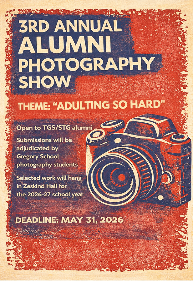 This year’s submissions will be adjudicated by current Gregory School photography students, turning the tables and bringing fresh eyes to alumni work. Selected images will be exhibited in Zeskind Hall and proudly displayed throughout the 2026–2027 school year.