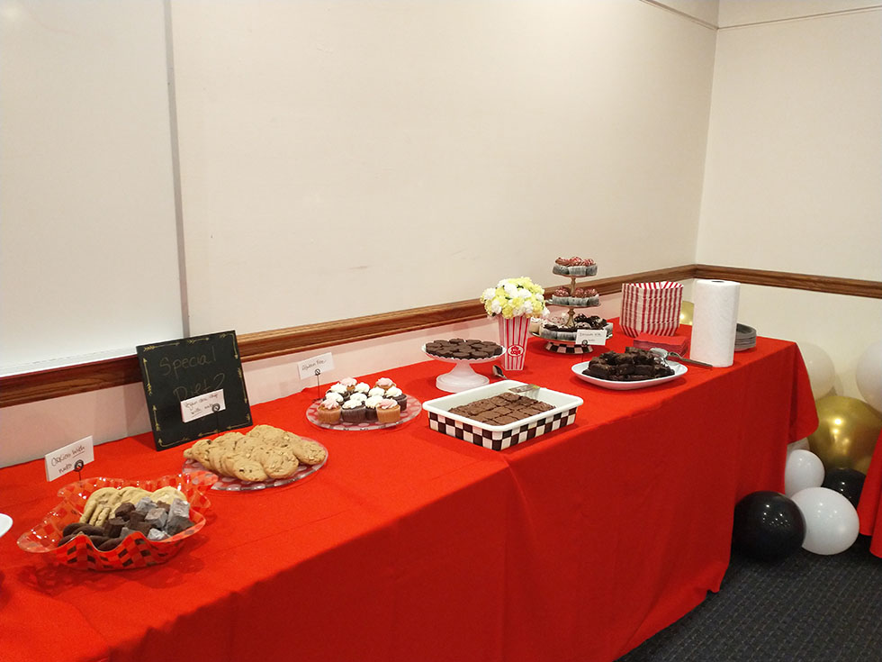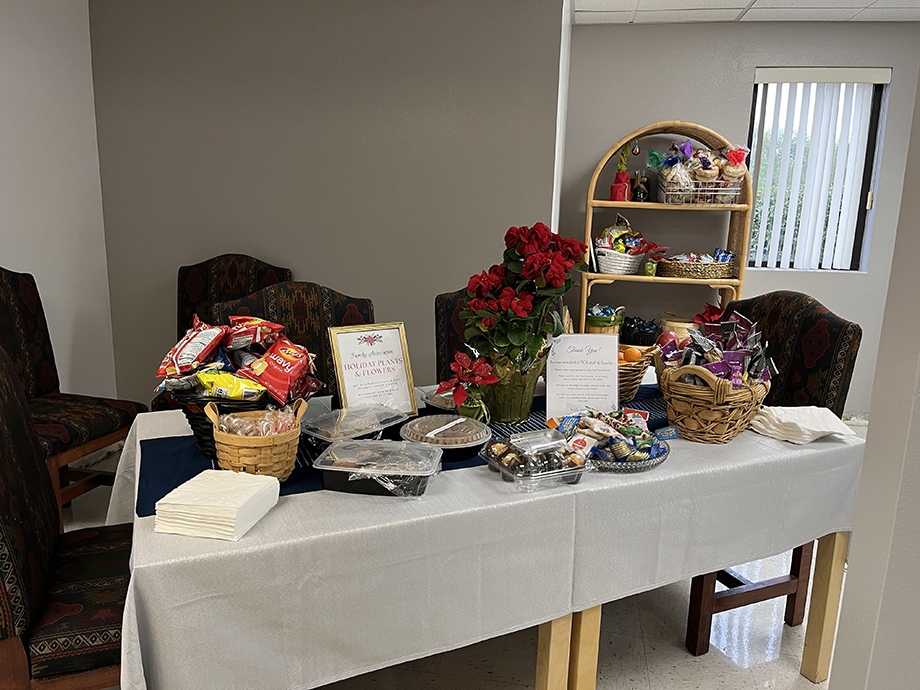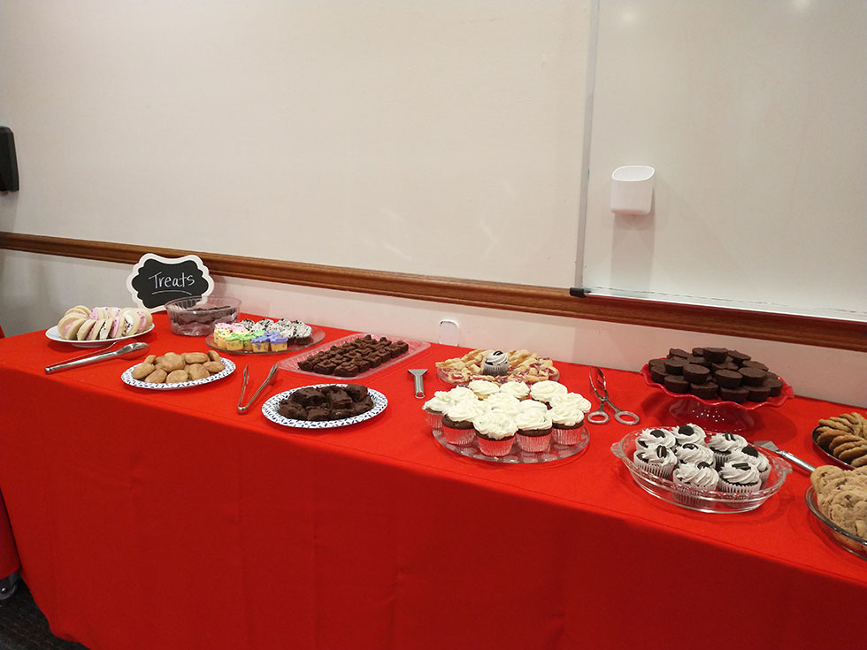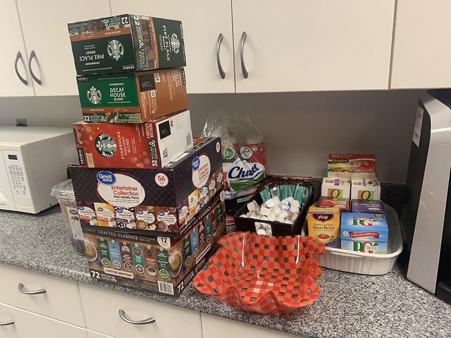 Families stock the faculty/staff lounge with goodies and surprises to keep everyone fueled during finals week.
