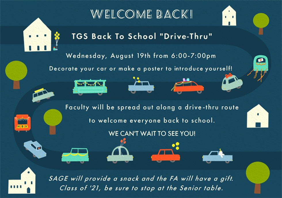 Thank you! By now you have received a separate invitation to join us for a “Welcome Back Parade” on campus next Wednesday evening, August 19th, from 6-7 p.m. Our intent is to provide a fun activity for you and your children—teachers will be present along the parade route introducing themselves to you in a myriad of creative ways. We’ll have stops along the way, including a gift from our Family Association and from SAGE, our food service provider. The class of 2021 should be sure to stop by the senior table for a surprise. You are welcome to put a sign on your car introducing yourselves, but please don’t feel any obligation to do so. The only rules are to drive slowly, safely, and stay in your car. Staff members will be directing traffic to ensure everyone’s safety as well.