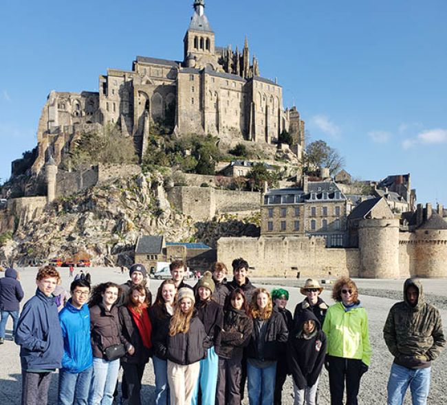 French teacher Mme Amy Clashman led a 10-day spring break trip to France in 2023 for 8th-12th grade students who studied French. The trip included stays in Normandy, Brittany, and the Loire Valley, as well as several days in Paris. It focused on history, arts, and culture, as well as plenty of time to shop, be a tourist, experience regional cuisine,and practice speaking French. The students even got to spend a morning in a French school. Mme Clashman hopes to offer another trip to France for spring break 2025.