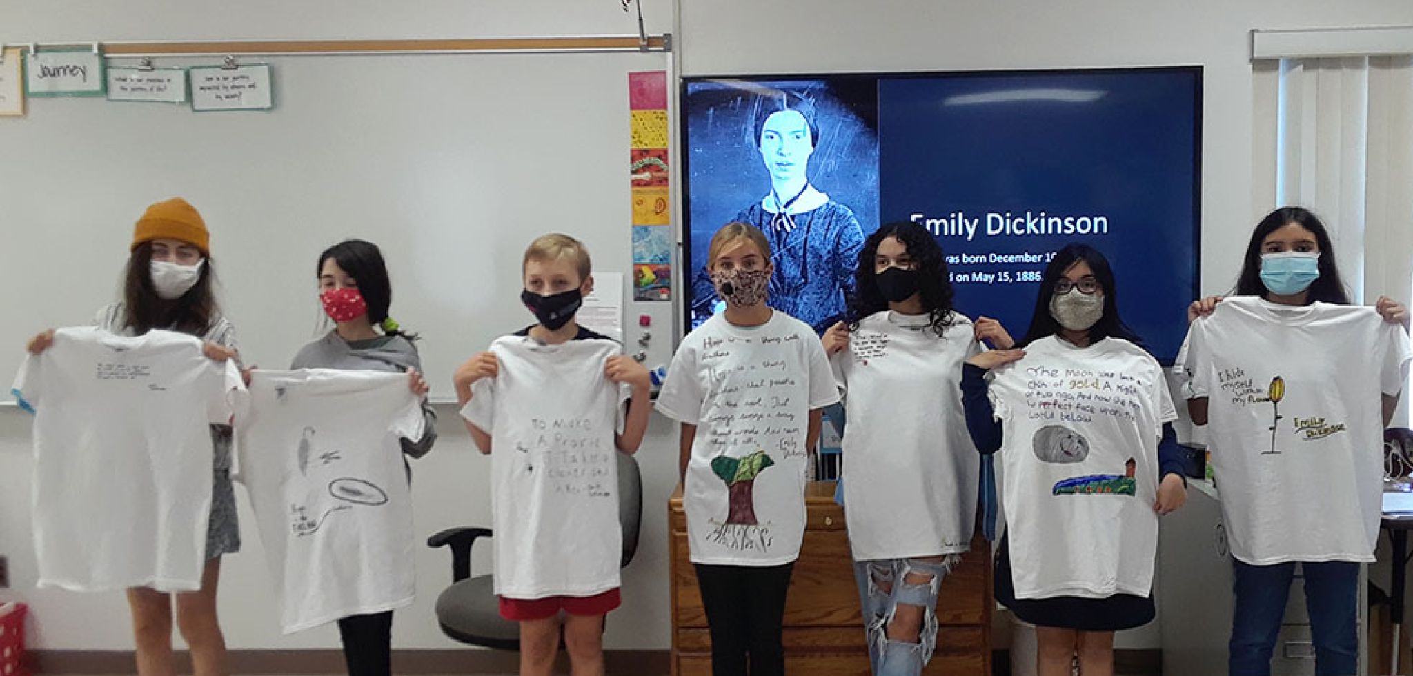 In a culminating activity, each student chose a passage of poetry that spoke to them and created t-shirts that displayed the words and images of this well loved American poet.