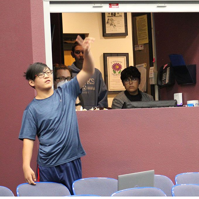 (Left) From the light and sound booth, Spamalot's student technical team communicates with director Ms. Lisa Bodden during a rehearsal. (Right) Spamalot's cast includes students in grades 5 - 12.