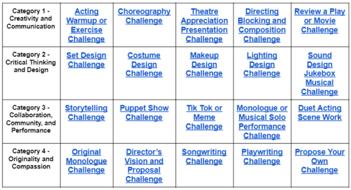“When searching for ideas for online instruction, I found these words repeated over and over: flexibility, choice, and creativity,” drama teacher Lisa Bodden said. “I found and adapted a Theatre Project Challenge—a choice board of 20 projects that the students can choose from. I tweaked the choices and plotted them into a 6 Cs table so students know the general skills to be addressed in each group.”