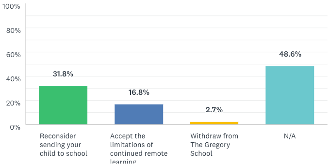 If you do not plan to send your child back to school in person, the current zoom sessions will not be available unless we have faculty working remotely who might be teaching one of your child’s classes. Instructional sessions will be video recorded with cameras to the extent possible for synchronous and/or asynchronous viewing for our students at home. Knowing this, will you be likely to….