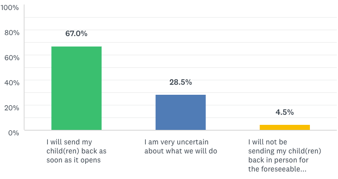 As you can see from the bar graphs, a strong majority of families feel comfortable in having their children return to school once Pima County hits the desired health metrics for COVID-19. Additionally, those still uncomfortable with the idea of sending their child back to campus are willing to work with us as we figure out how best to continue to serve their children’s needs remotely. And finally, we are grateful that many of you recognize the costs associated with all of the COVID-19 safety protocols and have committed to support the school financially.